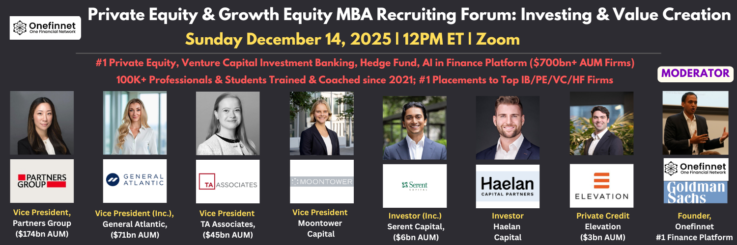 Join this exclusive Onefinnet MBA Private Equity & Growth Equity Forum - on Sunday Dec 14 at 12PM ET on Zoom - led by Speakers from Top-Tier Large Cap & Middle Market Funds...