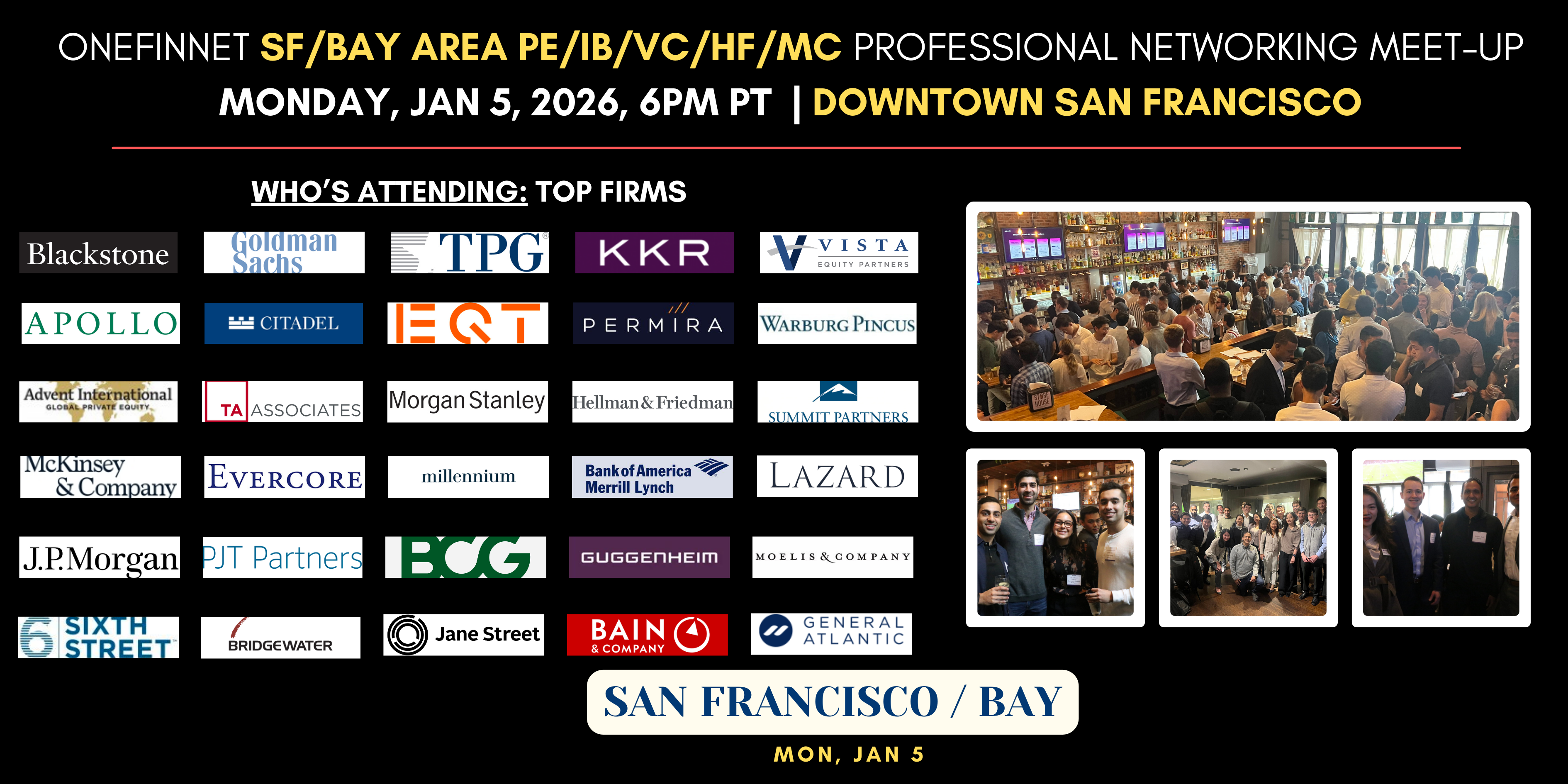 Due to popular demand, Onefinnet is hosting a PE/VC/GE/HF/IB Networking event for our San Francisco / Bay Area-based PE, VC, GE, HF, IB, MC Professionals on Monday, Jan 5 at 6PM ET in Downt...