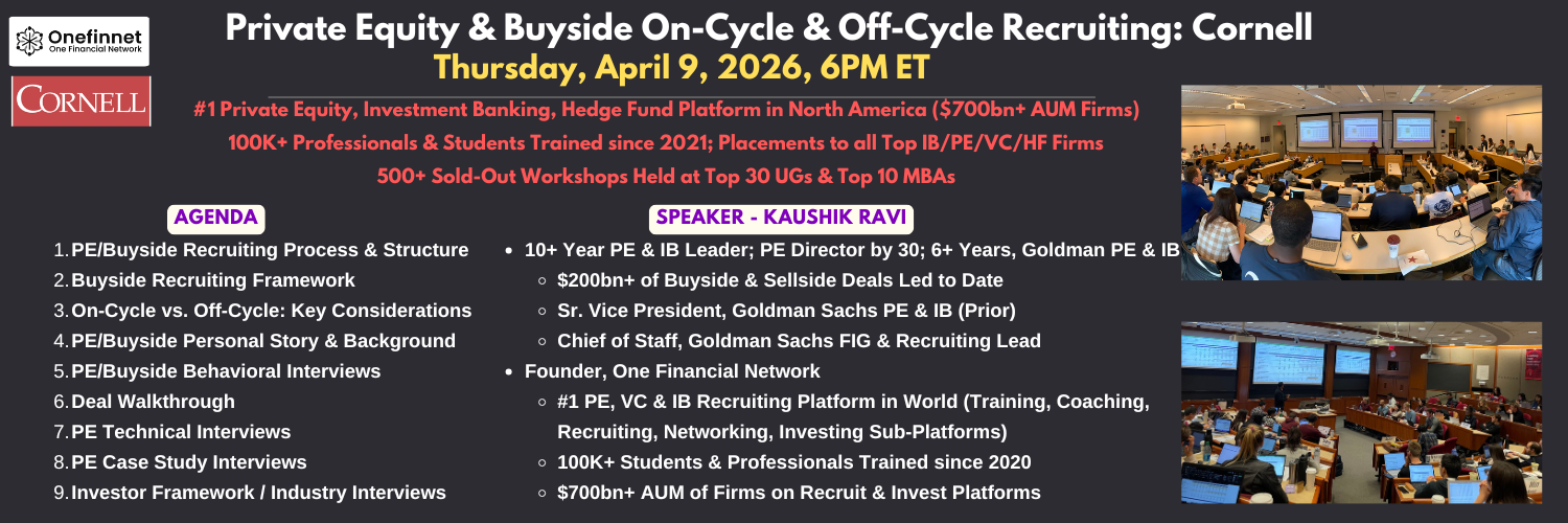 Due to popular demand, join an exclusive Cornell Private Equity & Buyside On-Cycle & Off-Cycle Recruiting Workshop, led by speaker Kaushik Ravi, Founder at...