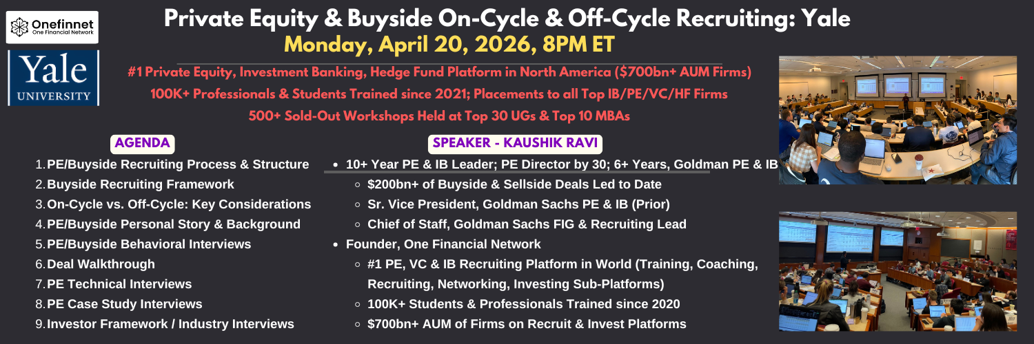 Join an exclusive Yale Private Equity & Buyside On-Cycle & Off-Cycle Recruiting Workshop, led by speaker Kaushik Ravi, 10+ Year Private Equity Leader, Foun...